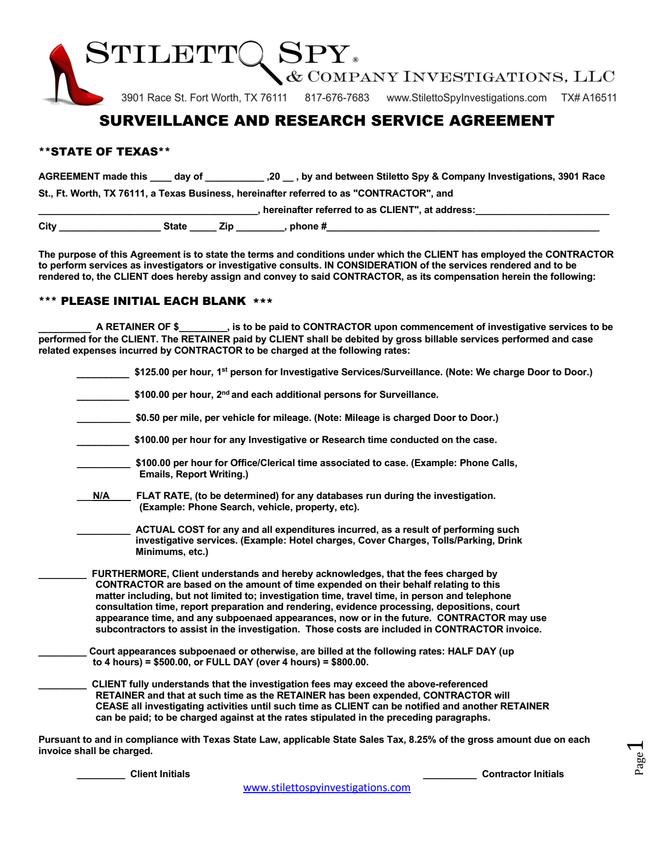 - Satisfied Clients and Law Enforcement Officers Refer Us : Stiletto Spy and Company Investigations have a long track record of closing cases in the Dallas Fort Worth Area. Don’t take our word for it; we have reviews that show the quality of our services.